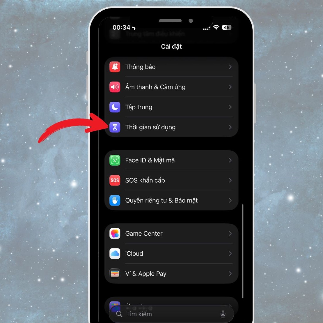 Trong giao diện Cài đặt, kéo xuống và chọn Thời gian sử dụng (Screen Time).