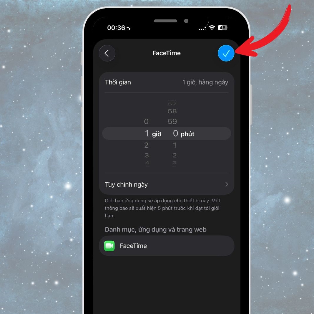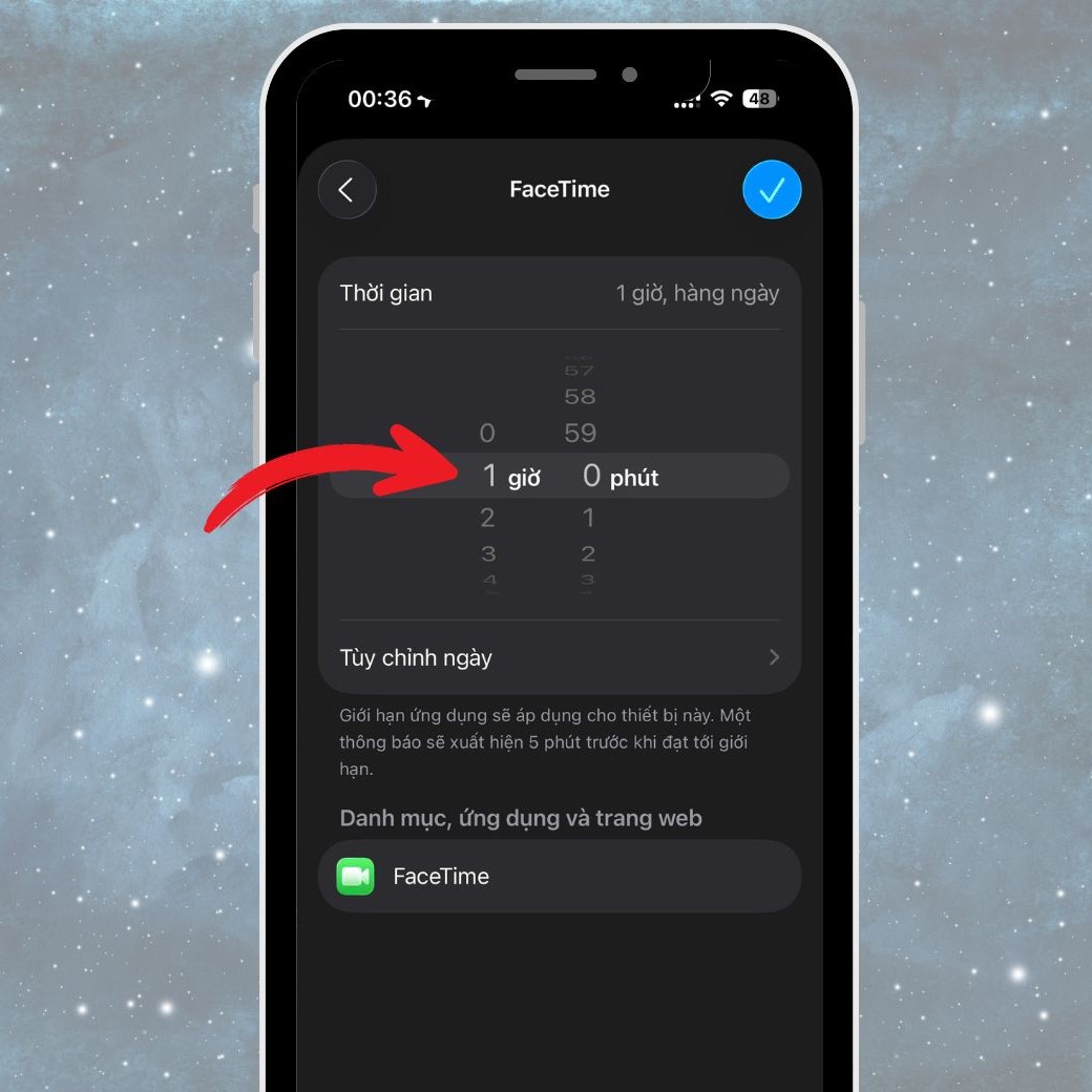 Thiết lập khoảng thời gian tối đa trong ngày mà bạn muốn cho phép, ví dụ 30 phút hoặc 1 giờ. Khi hết thời gian, iPhone sẽ tự động chặn truy cập ứng dụng và yêu cầu nhập mật mã để tiếp tục sử dụng.