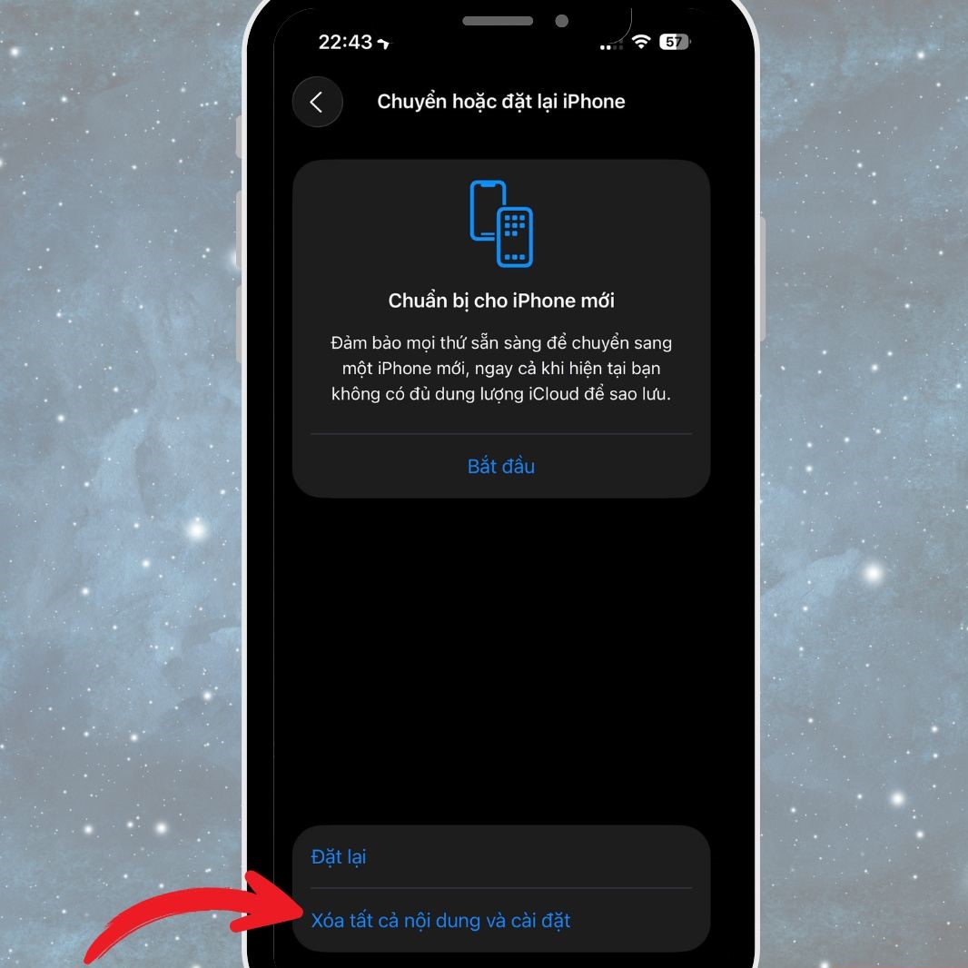 Tiếp tục nhấn vào Xóa tất cả nội dung và cài đặt.