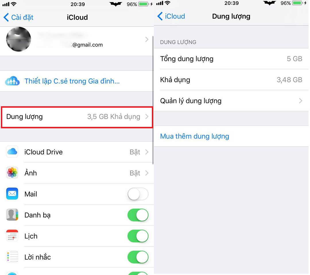 Để kiếm tra dung lượng còn lại của tài khoản iCloud, bạn vào mục Dung lượng để quản lý dữ liệu hoặc mua thêm bộ nhớ để lưu trữ.