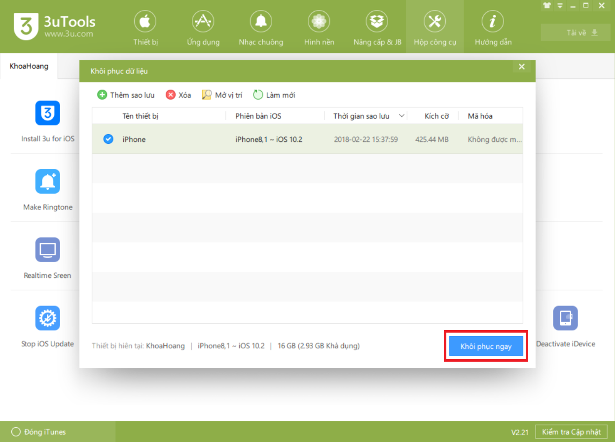 Vậy là bạn đã tiến hành sao lưu thành công dữ liệu trên thiết bị điện thoại IPhone của mình rồi. Để khôi phục lại dữ liệu này trên thiết bị, bạn cũng làm với thao tác tương tự: Chọn Backup/Restore Khôi phục dữ liệu Lựa chọn bản sao lưu phù hợp Khôi phục ngay.