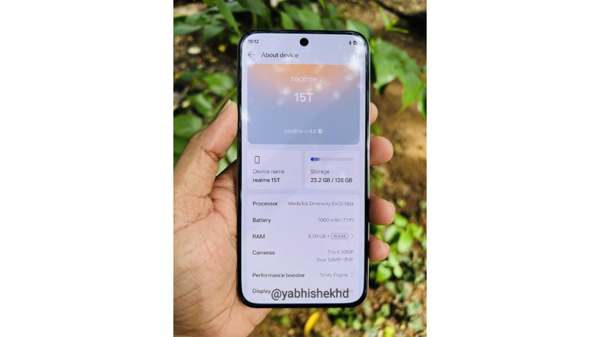 Realme 15T lộ thông tin với thiết kế mỏng nhẹ, pin 7000 mAh và chip Dimensity 6400 Max